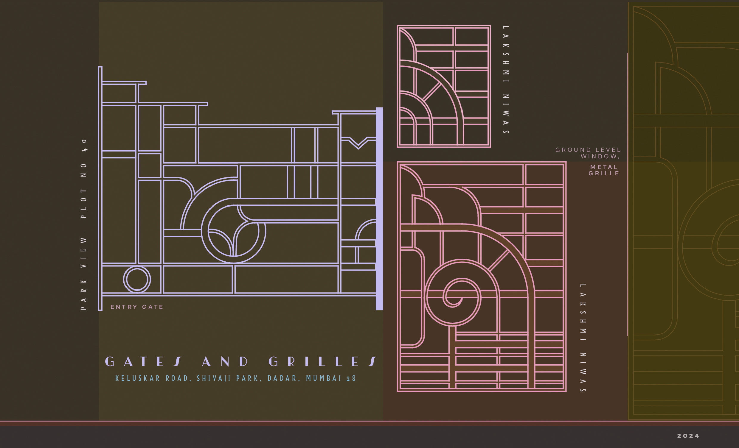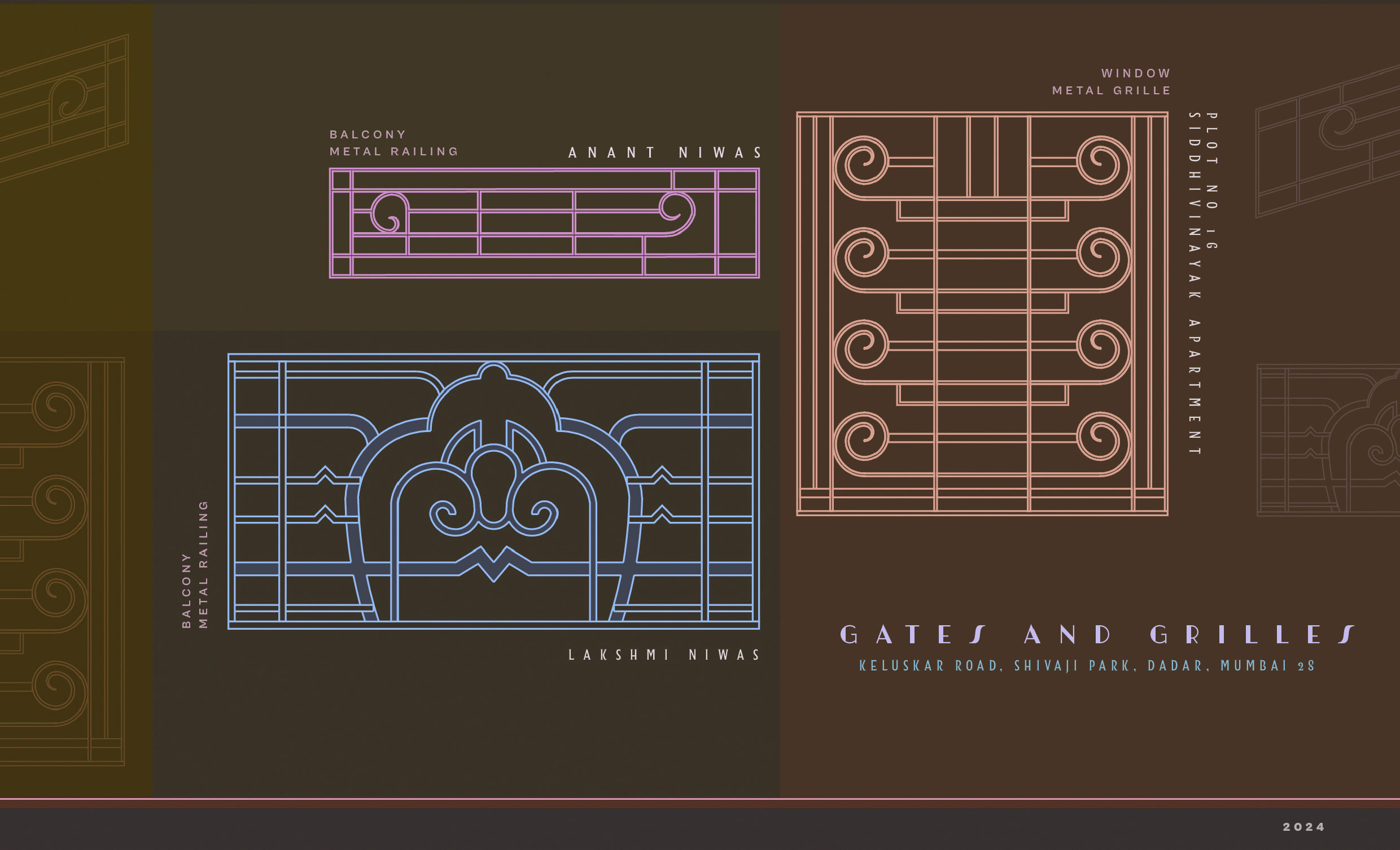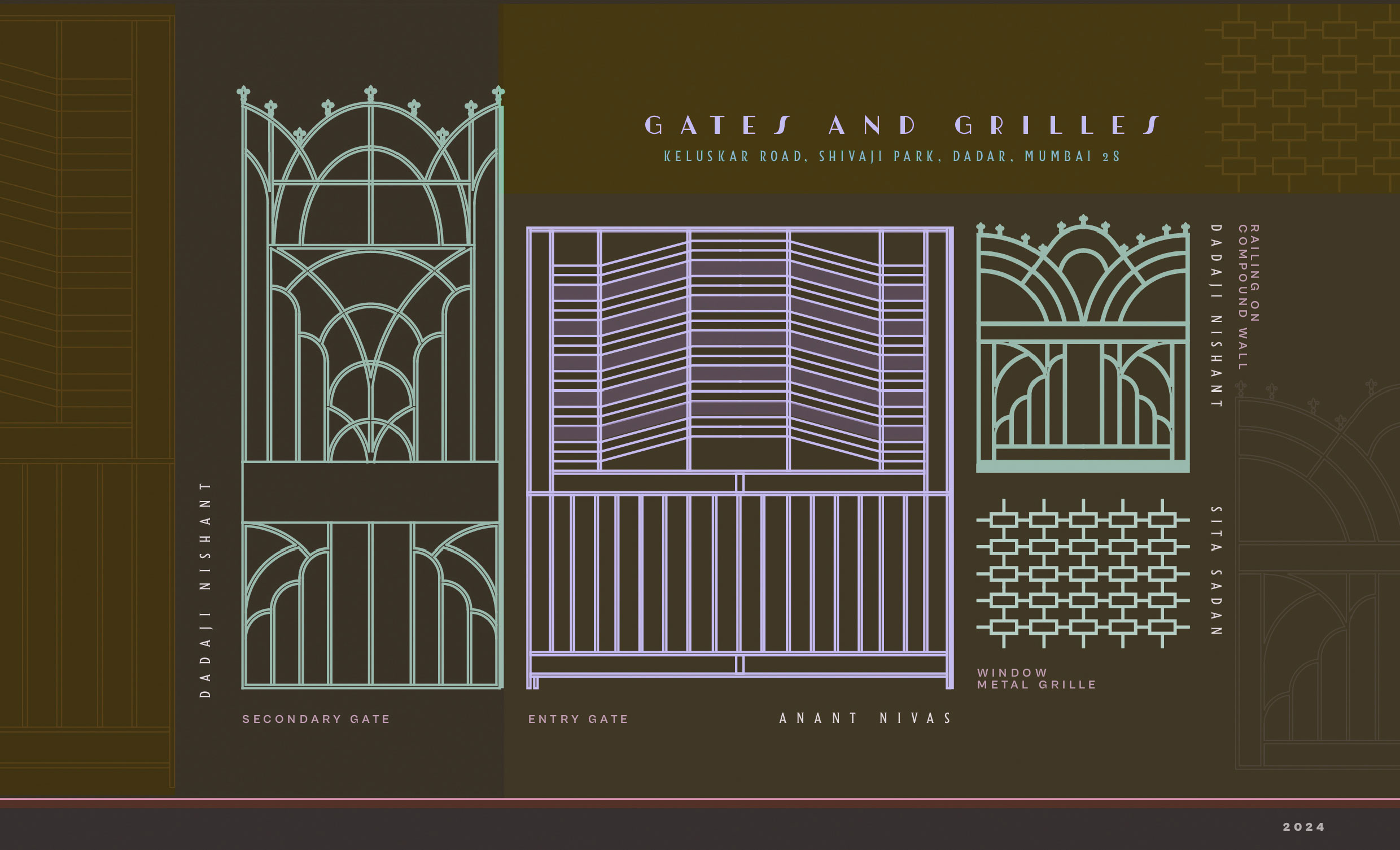This initial collection documents the ‘Gates and Grilles’ featuring Art Deco characteristics. These gates and grilles are more than just functional—they are artistic expressions. The use of metalwork showcases skilled craftsmanship, blending both decorative and practical purposes. These features not only define boundaries but also enhance the visual appeal of the property, making them integral components of the Art Deco charm in Shivaji Park.