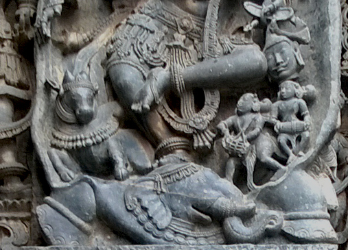 [As the Hoysaleshwara Temple complex contains twin temples of Hoysaleshwar and Shantaleshwar, the depictions of Uma-Maheshwara could also refer to Vishnuvardhana-Shantaladevi, as the Royal Couple.]